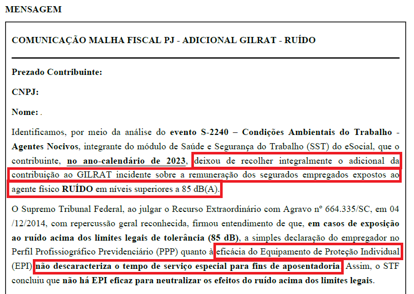 A empresa foi notificada por não ter realizado a complementação tributária (GILRAT) para funcionários que trabalharam expostos a níveis de ruído acima do limite de tolerância.