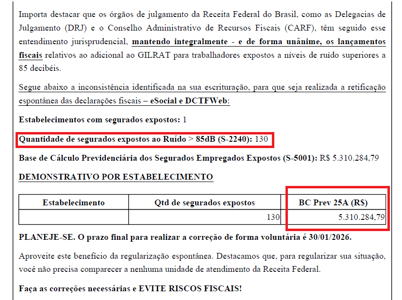 Em continuidade à notificação recebida, a Receita Federal indica a quantidade de funcionários expostos a níveis de ruído acima de 85dB(A) e a Base de Cálculo a ser adotada para cobrança dos recolhimentos tributários que a empresa deveria ter feito.